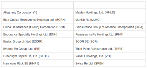 In the process of analyzing and valuing a company, it can be helpful to look at the recent and expected performance of other companies operating in the same industry. Publicly traded guideline companies can be used to develop a range of valuation multiples that may be applicable to a subject company.6 Listed below is a group of publicly traded companies (the "Industry Group") that are generally representative of the reinsurance industry.
